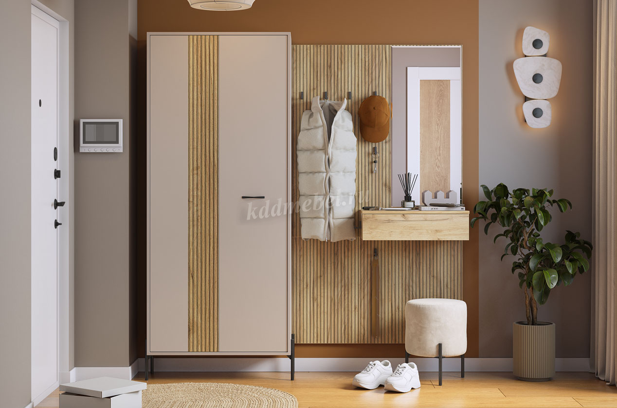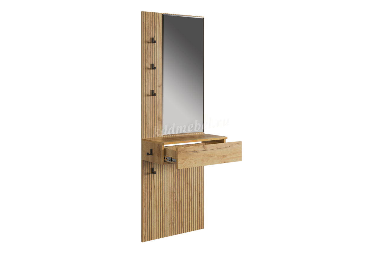 Принт, имитирующий вертикальную фрезеровку, придает зеркалу уникальный и современный вид, добавляя текстуру и глубину. Крючки предоставляют удобное место для хранения сумок или аксессуаров. Выкатной ящик служит дополнительным пространством для хранения мелочей, таких как ключи, кошелек, косметика или другие небольшие предметы.